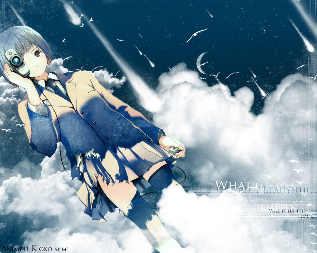 Description: A girl in a blue dress is flying through the clouds with a cell phone in her hand and a sky background.
