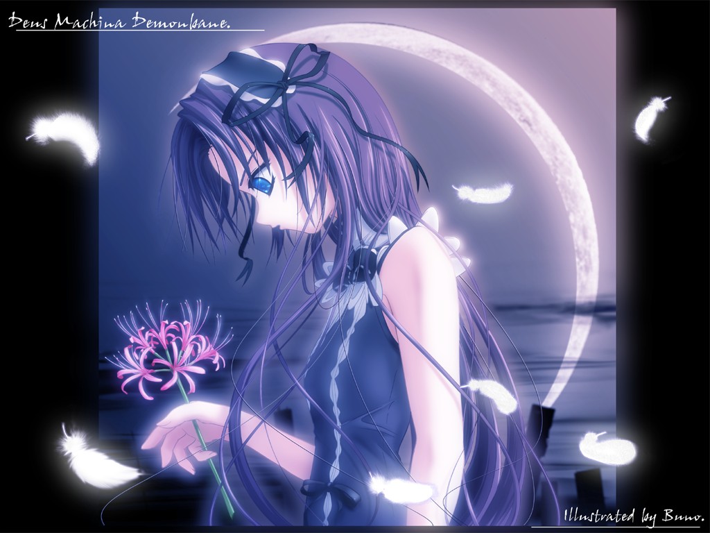 Description: A girl with long hair and a blue dress holding a flower in front of a full moon and a purple background.