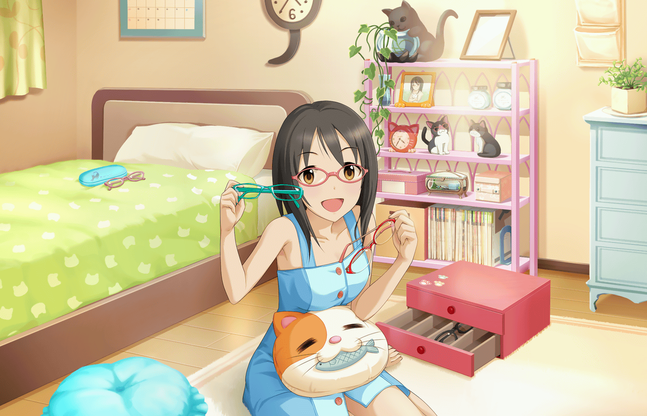 Description: A girl in a blue dress is holding a cat in her hand and a cat is sitting on the floor.