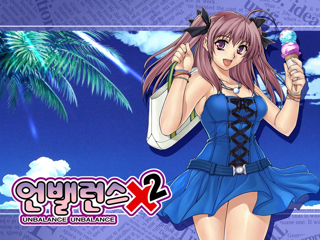 Description: A girl in a blue dress holding a pink ice cream cone in her hand and a palm tree in the background.