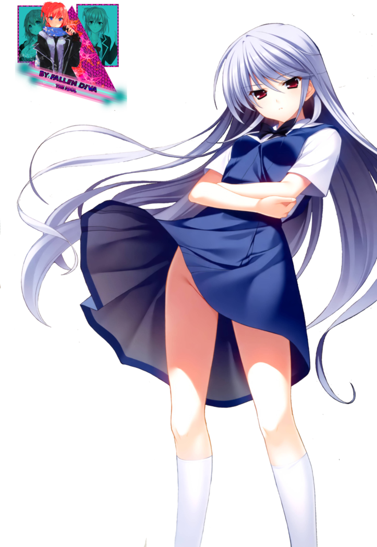Description: A girl with long hair and a blue dress is standing in front of a black background with a pink and white background.