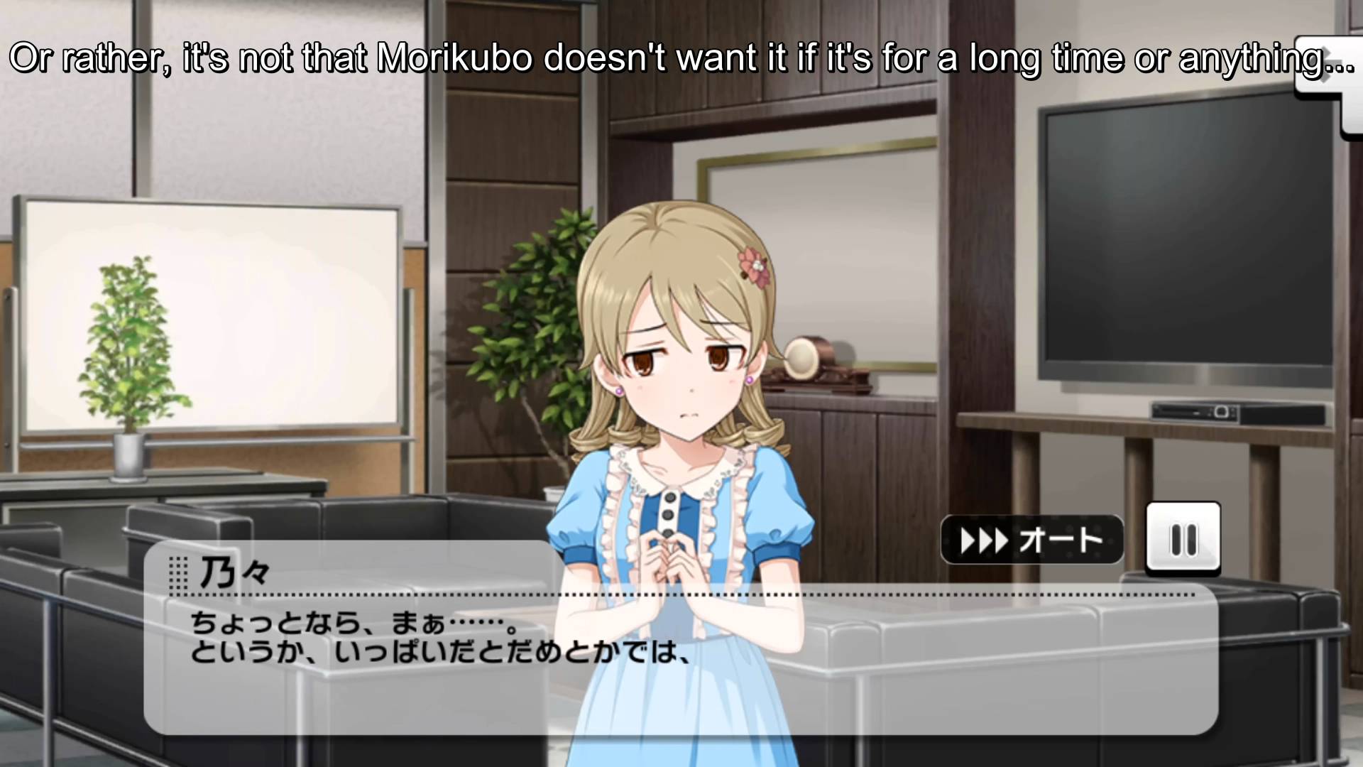 Description: A girl in a blue dress standing in a room with a tv on the wall and a table with a plant in it.