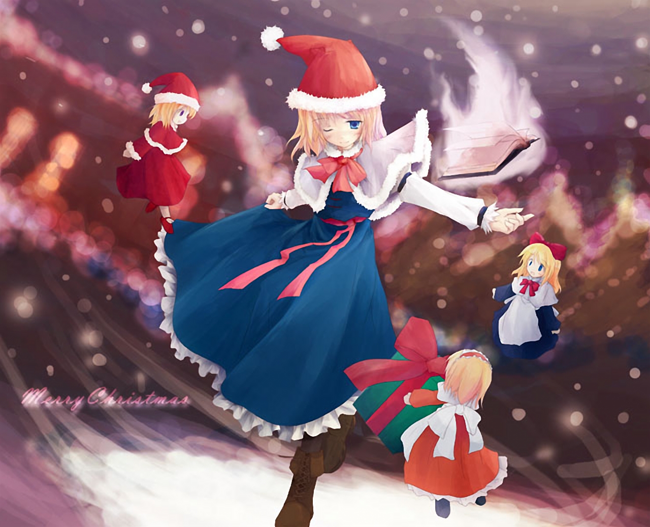 Description: A girl in a blue dress and a santa hat is skating on a rink with other girls in red and white outfits.