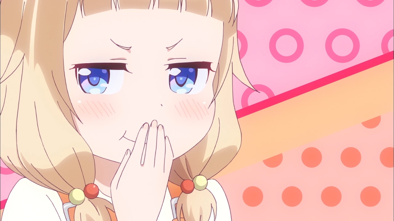 Description: A girl with blue eyes and blonde hair is looking at the camera and is covering her mouth with her hands.