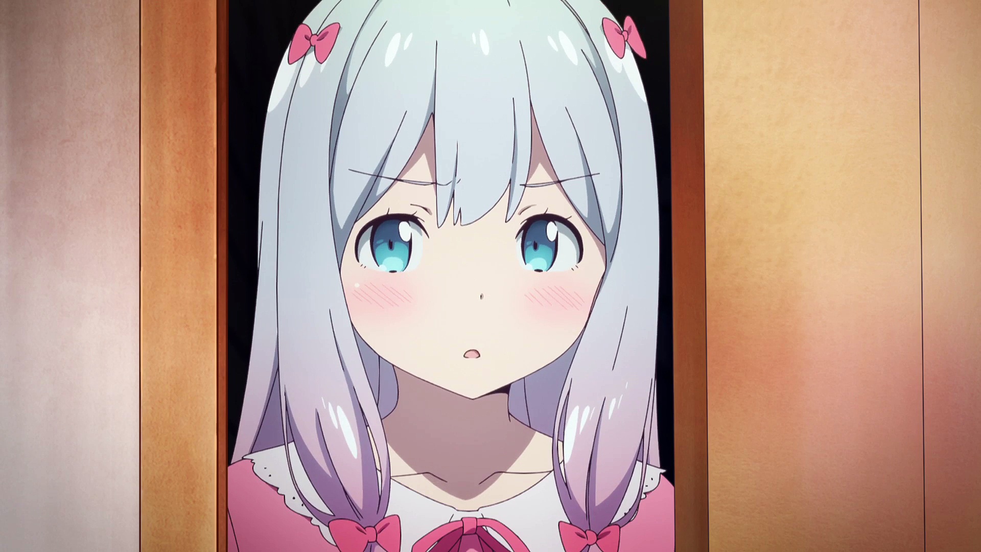 Description: A girl with blue eyes and pink hair standing in a doorway with a pink bow around her neck and a pink bow around her neck.