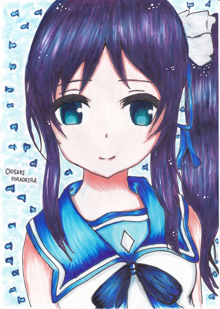 Description: A drawing of a girl with blue eyes and a sailor outfit with a bow on her head and a sailor's cap on her head.