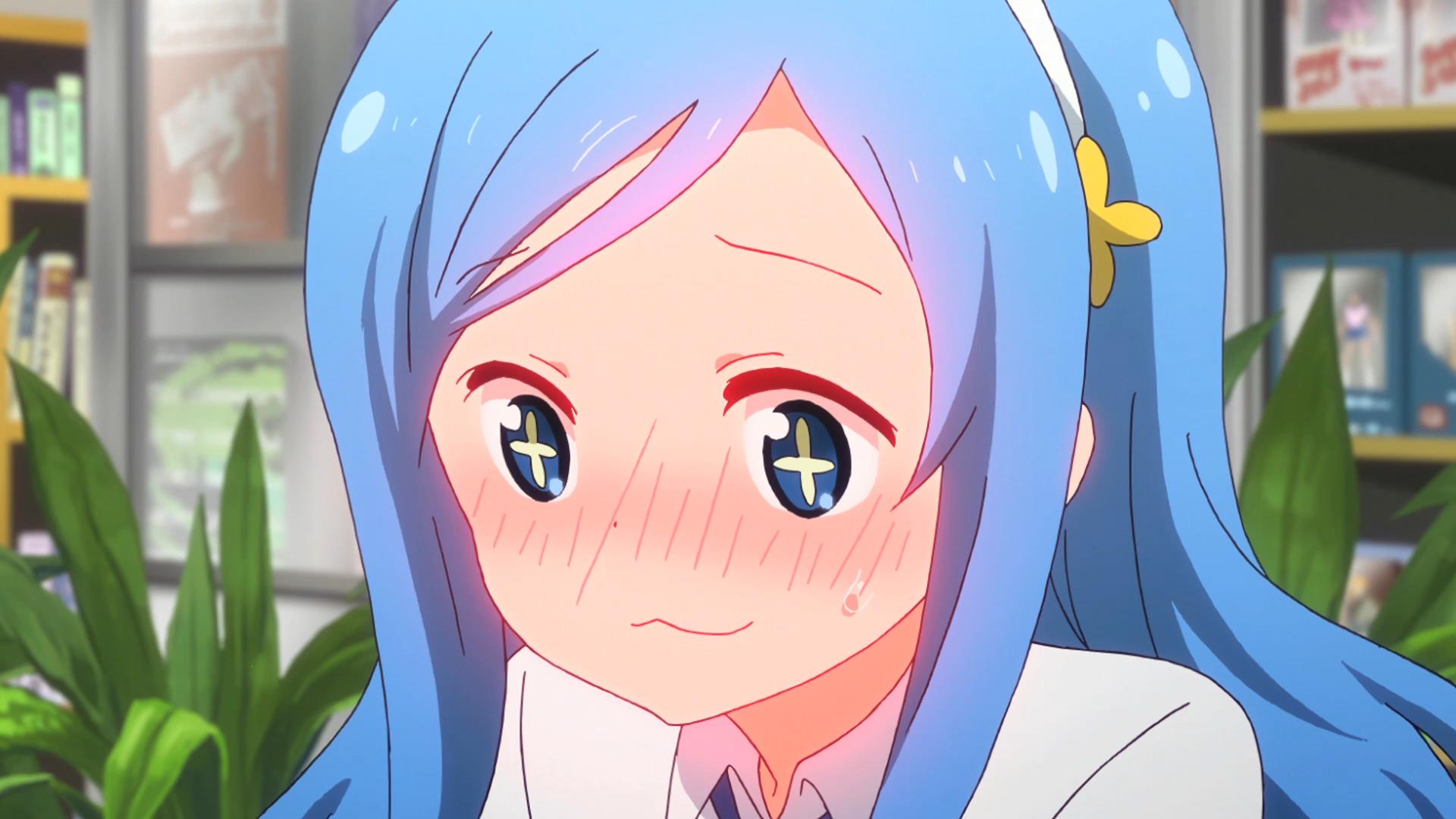Description: A girl with blue hair and blue eyes in a library with bookshelves and plants in the background.