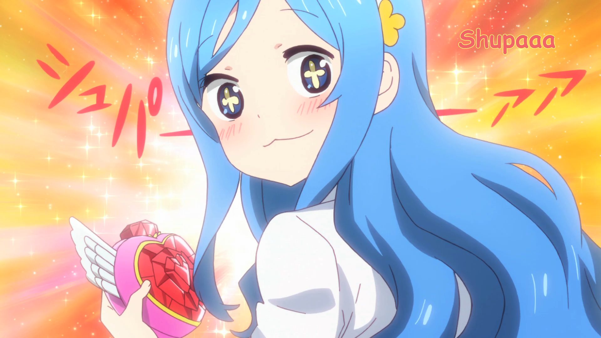 Description: A girl with blue hair holding a heart shaped object in her hand and a message that says shupaa.