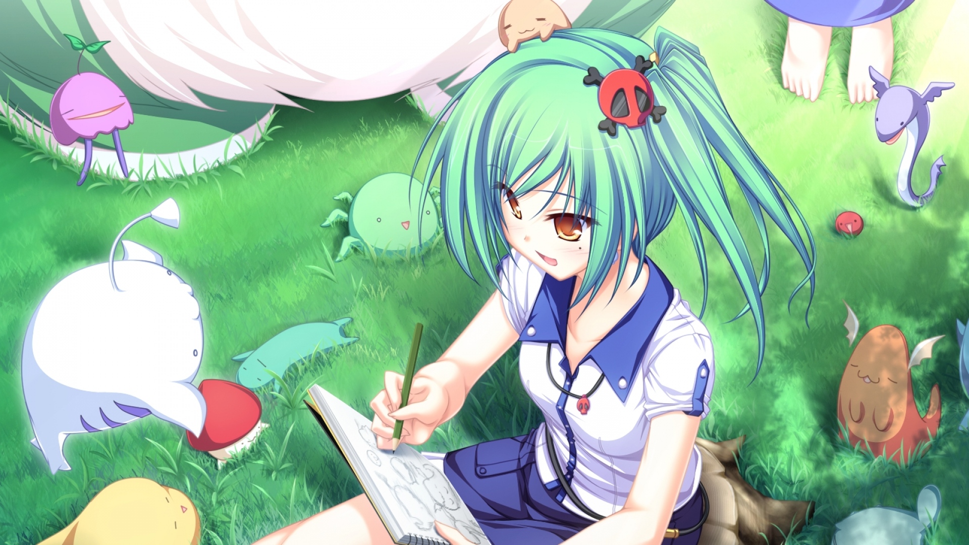 Description: A girl with blue hair sitting on the ground with a laptop computer in her hand and a bunch of other animals around her.
