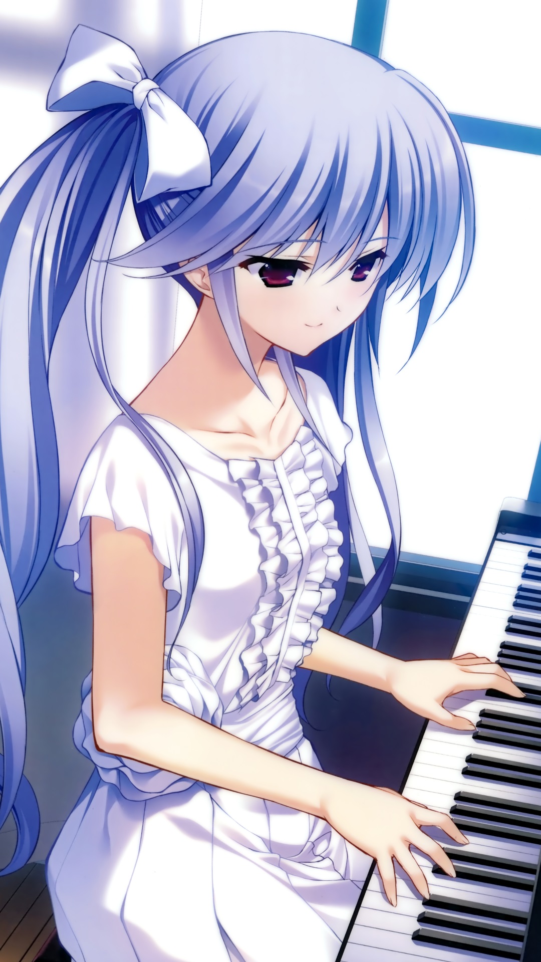 Description: A girl with long blue hair sitting at a piano playing the piano keyboard with her hand on the piano.