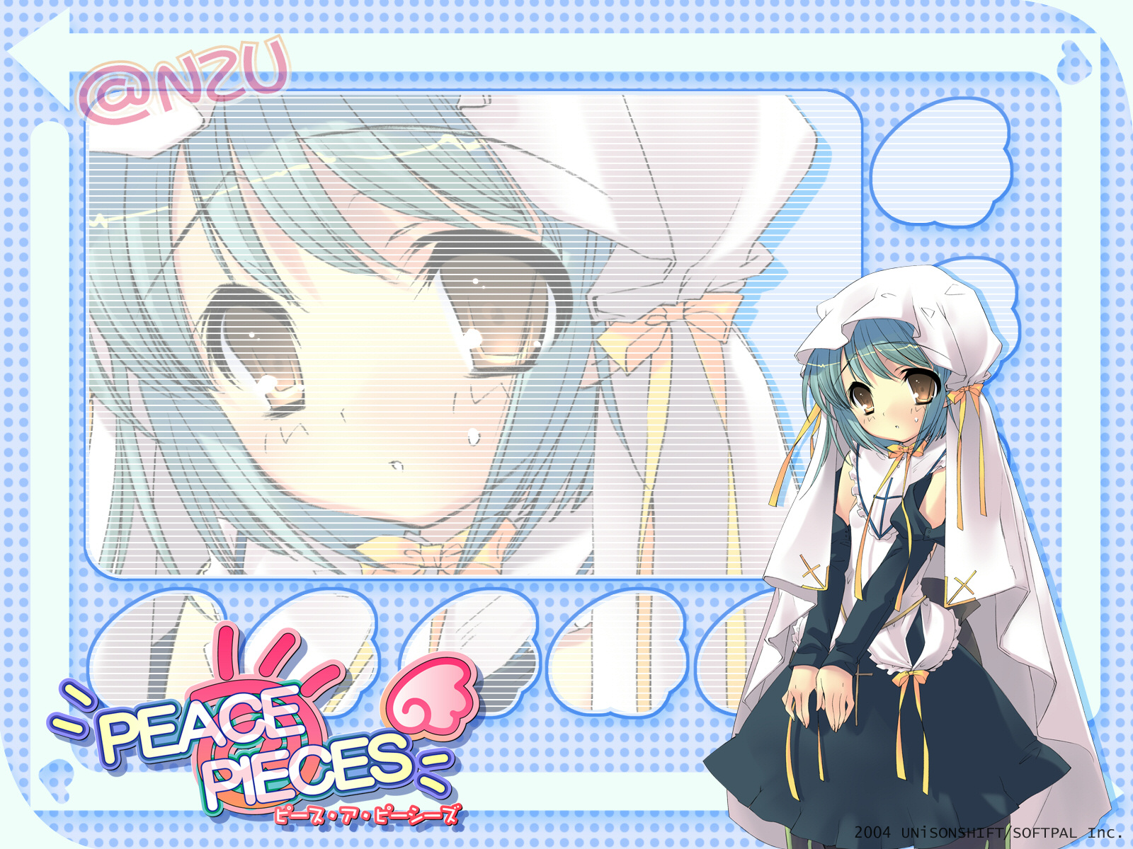 Description: A girl in a dress and hat with a blue background and a peace peace sign on it's side.