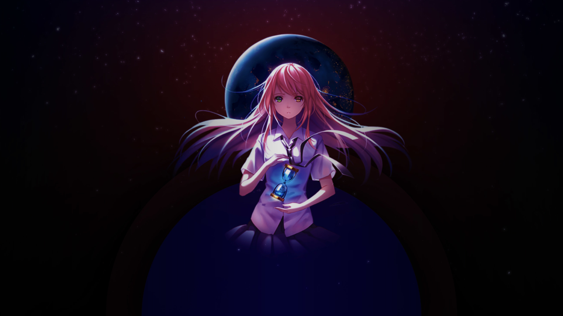 Description: A girl with long hair and a backpack standing on a planet with a moon in the background and a blue backpack in her hand.
