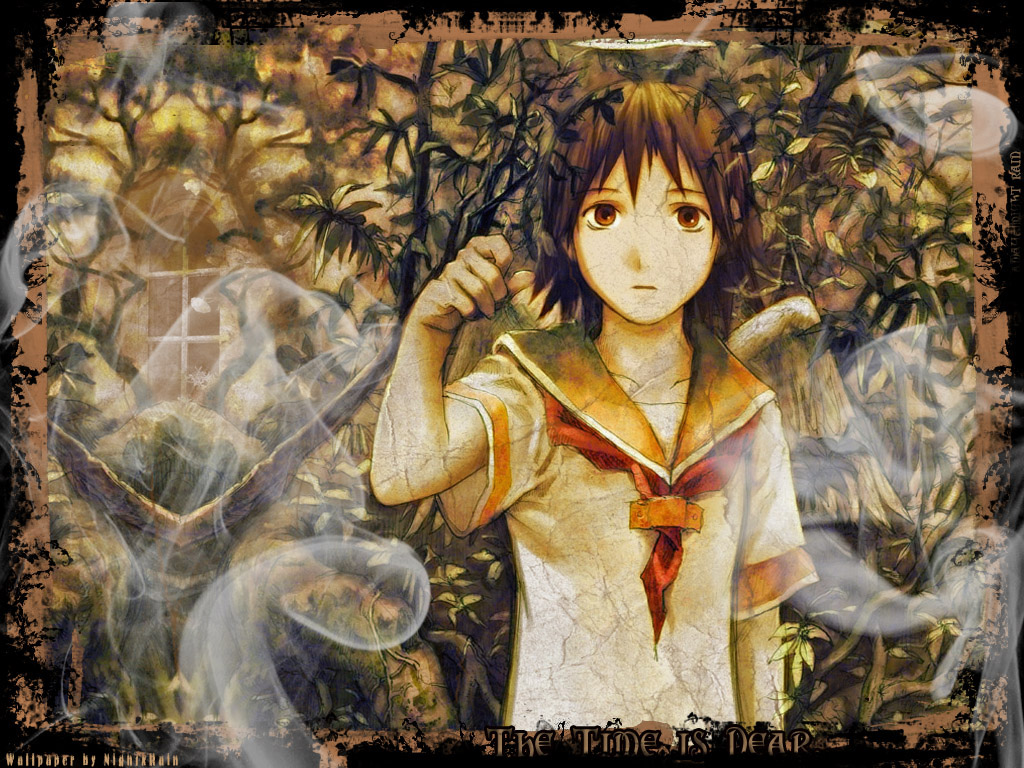 Description: A painting of a girl holding a book in her hands and a tree in the background with leaves and branches.