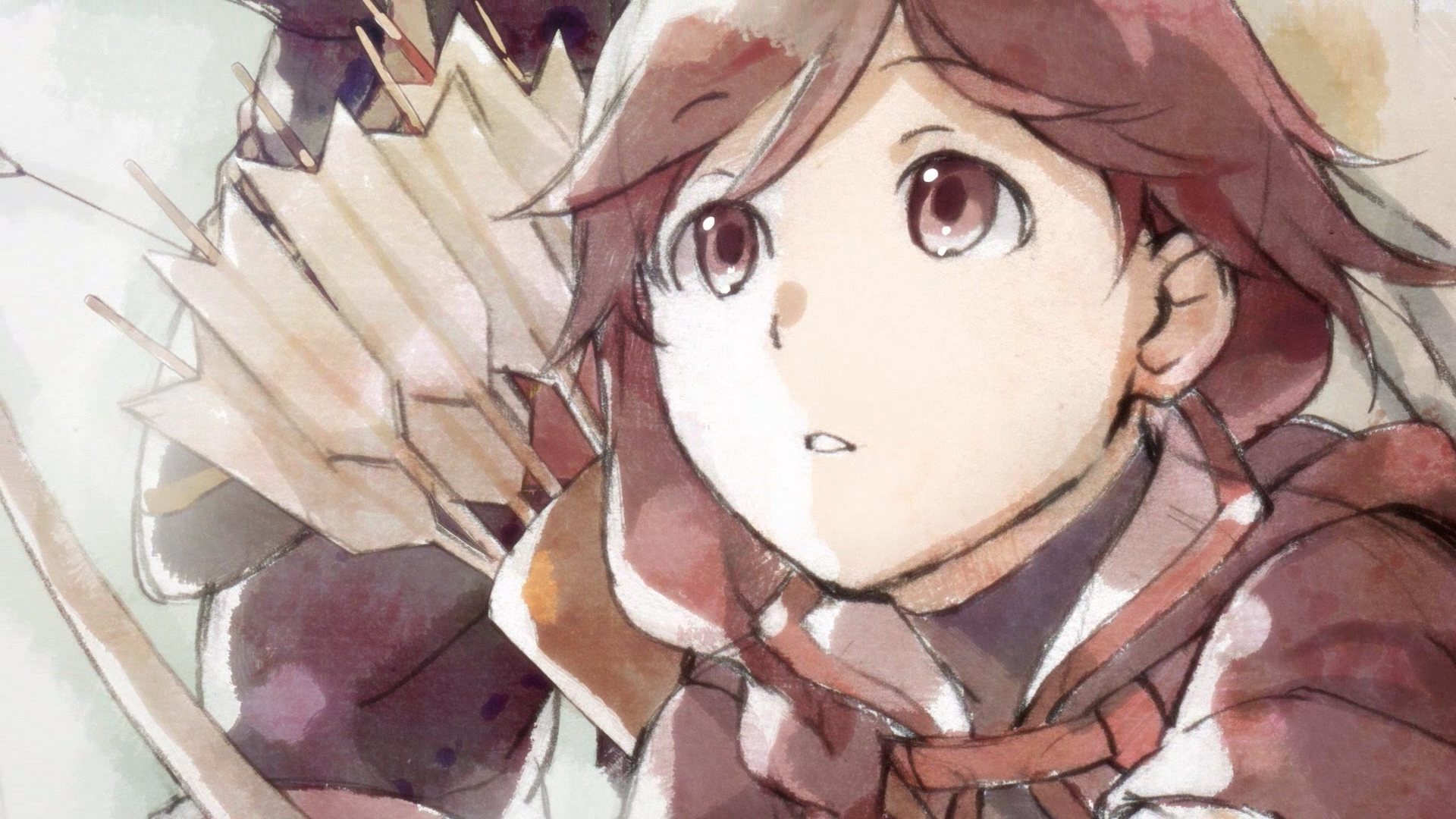 Description: A drawing of a girl with a bow and a sword in her hand and a bird on her shoulder.