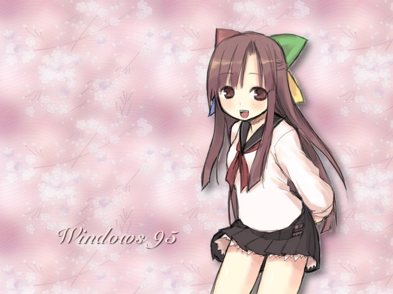 Description: A girl with long hair and a bow tie standing in front of a pink background with flowers and leaves.