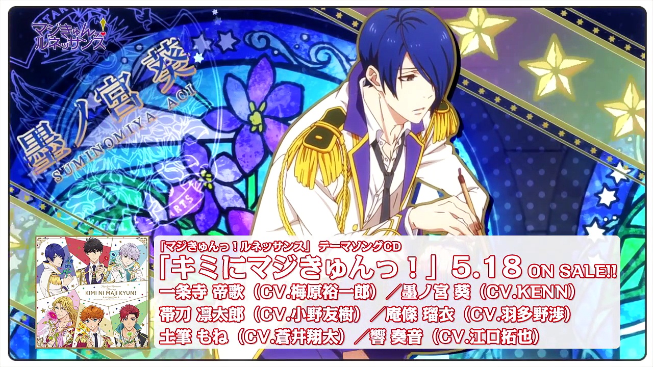 Description: A poster with a girl and a boy in front of a stained glass window with stars and a star.