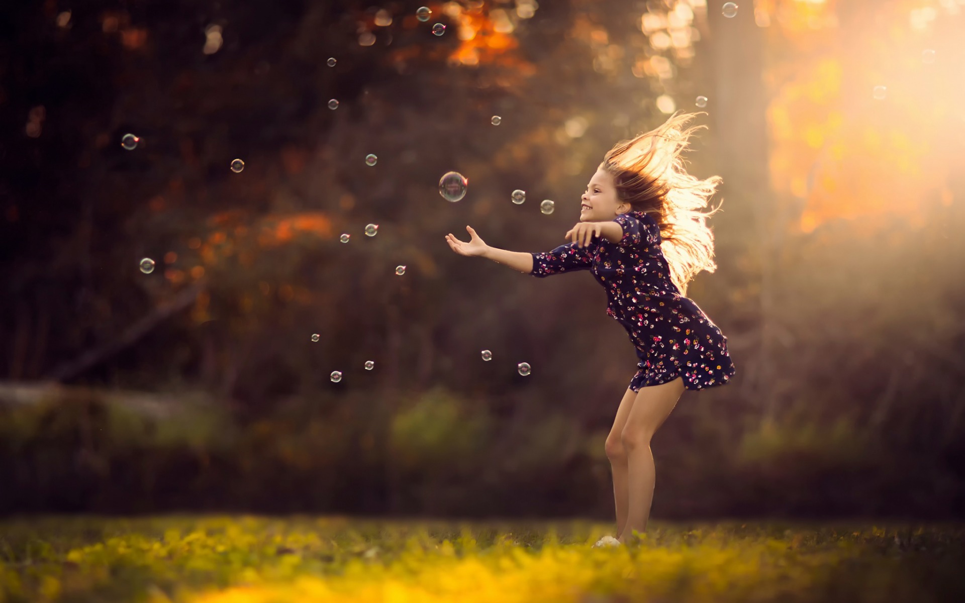 Description: A girl in a dress is playing with bubbles in a field of grass and trees in the background.