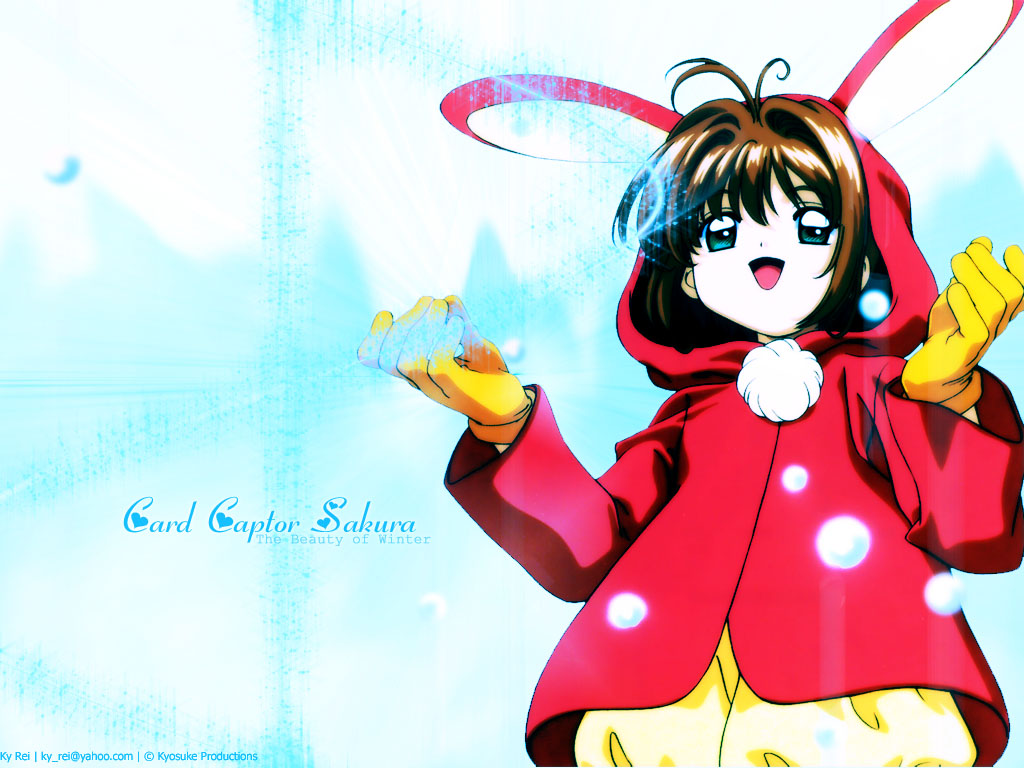 Description: A girl in a red coat holding a banana in her hand and a bunny ears on her head and a red coat on her head.