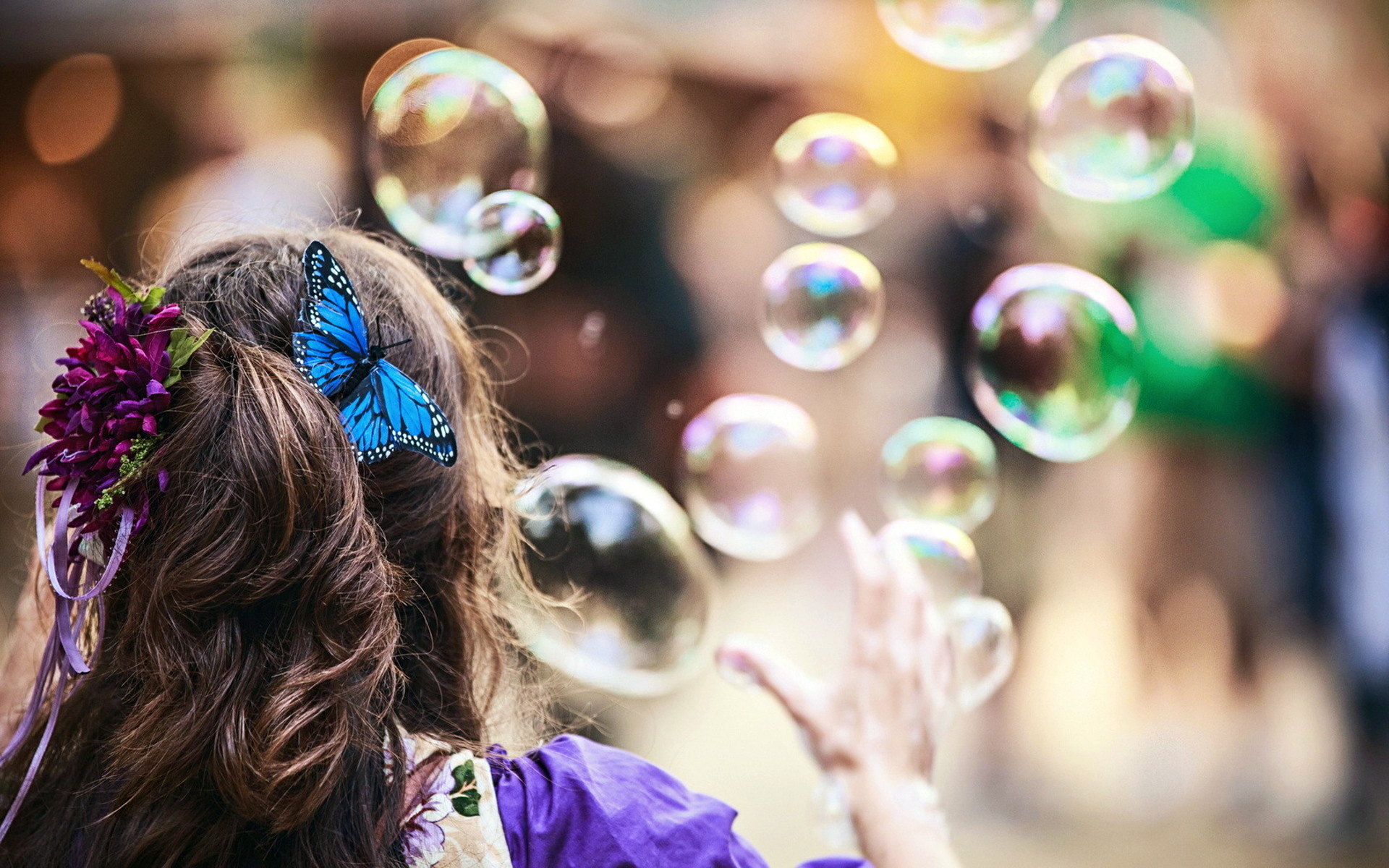 Description: A girl with a butterfly on her head blowing bubbles in the air with a crowd of people in the background.