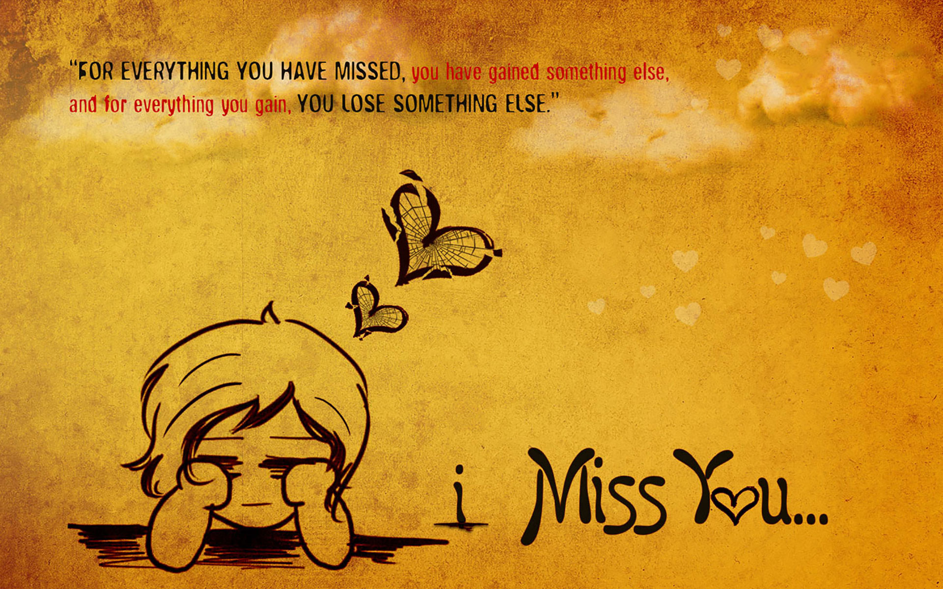 Description: A drawing of a girl with a butterfly flying over her head and a message below it that says i miss you.