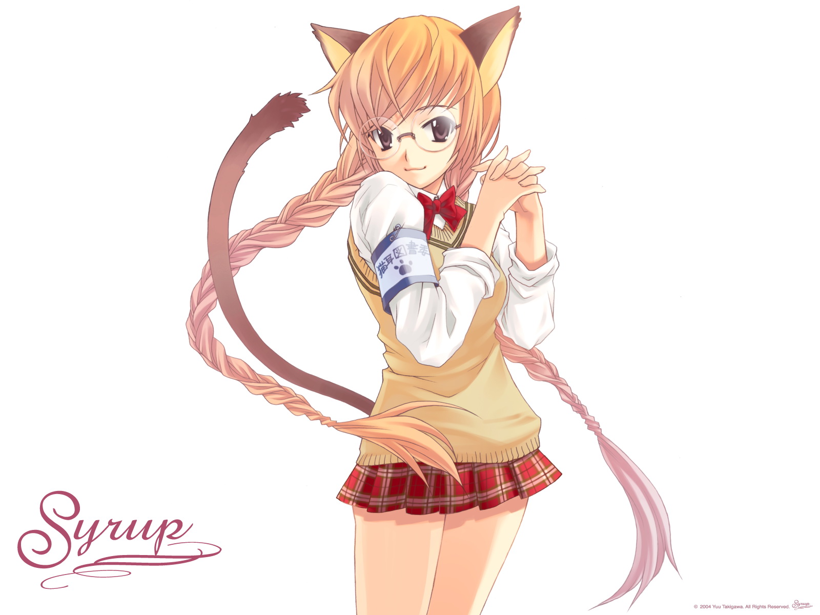 Description: A girl with a cat ears and a cat tail on her head and a cat tail on her shoulder.