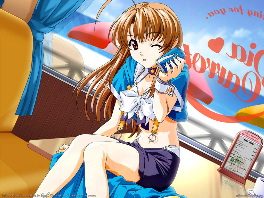 Description: A girl sitting on a couch talking on a cell phone with a sign in the background that says.