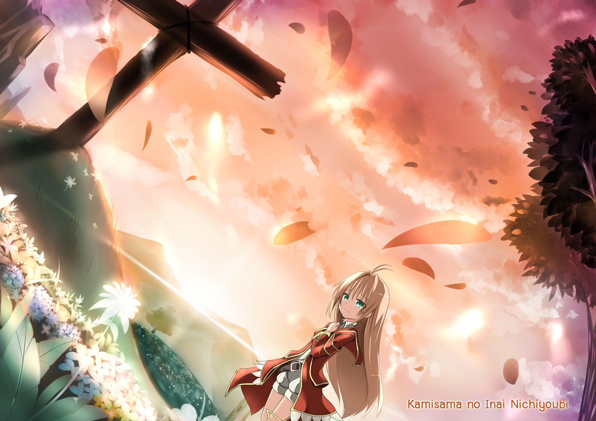 Description: A girl standing in front of a cross in a field of flowers and leaves with a sky background with clouds.