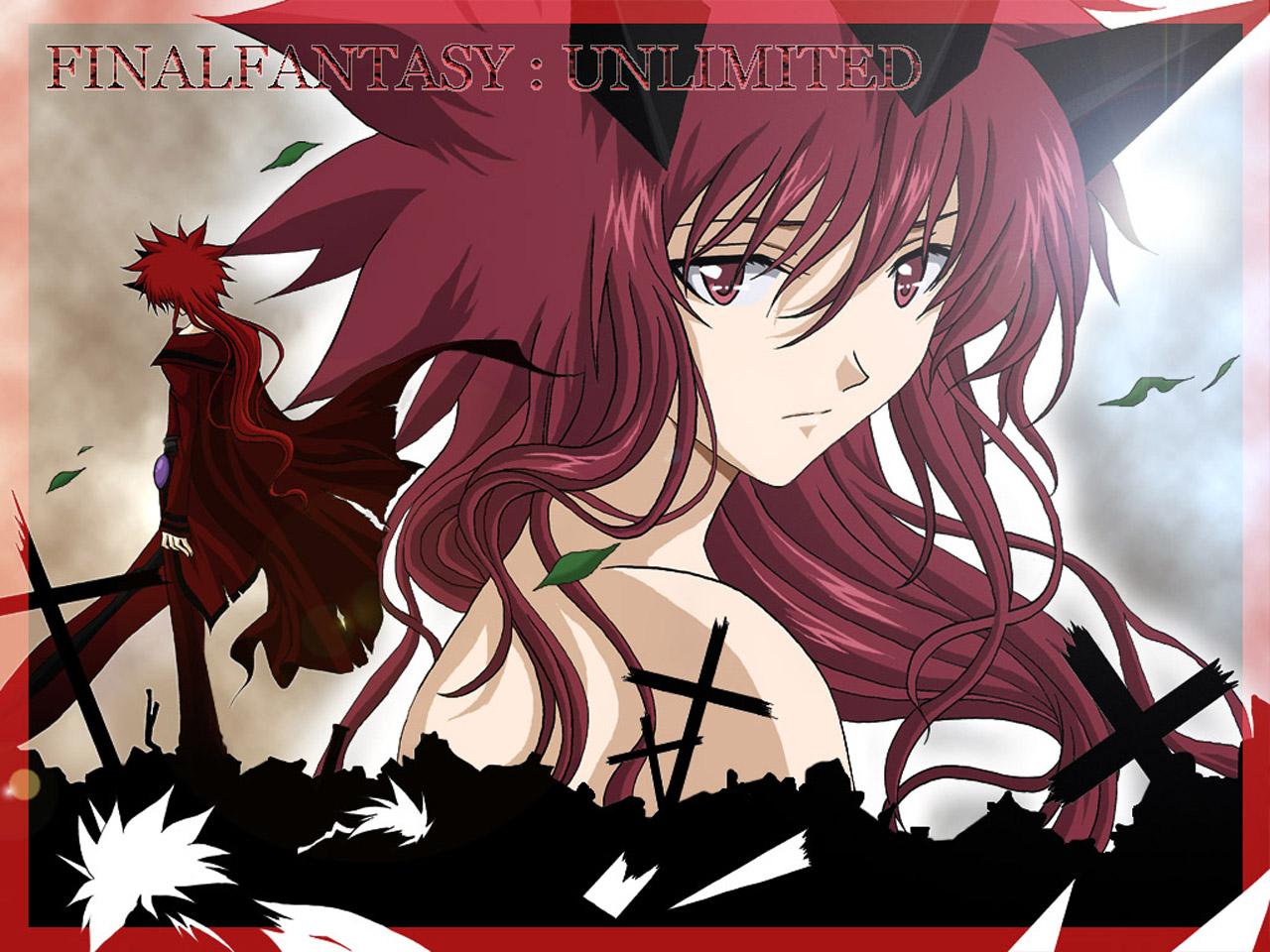 Description: A girl with long hair and a demon head is standing in front of a red background with a black bird.