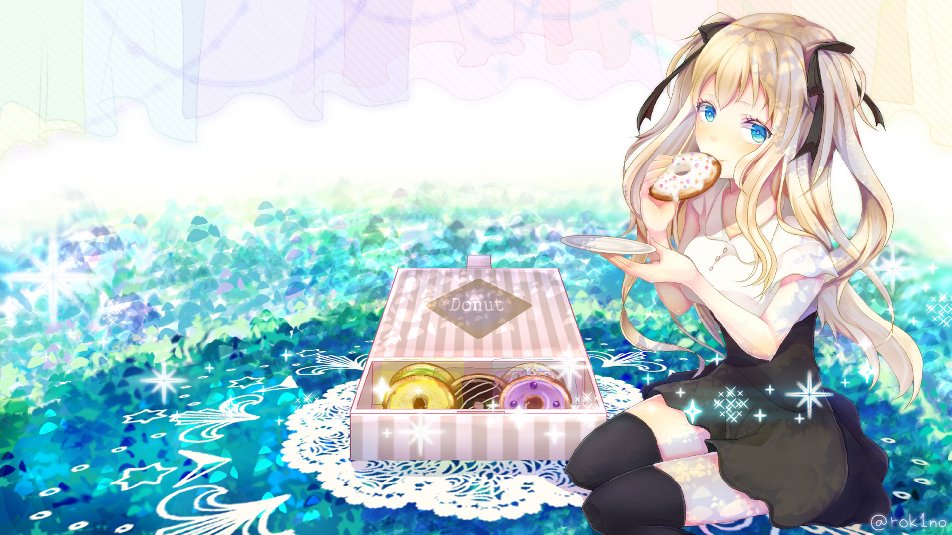 Description: A girl sitting on the ground eating a donut and holding a cupcake in her hand and a box of donuts in her other hand.