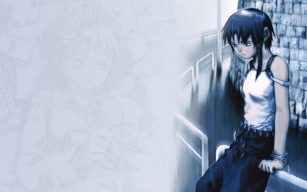 Description: A girl standing in a doorway with a brick wall behind her and a drawing of a man behind her.
