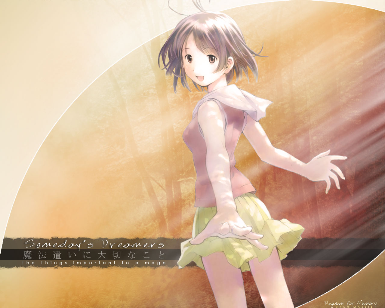Description: A girl in a dress standing in front of a circular background with a tree in the background and a yellow light shining on her.