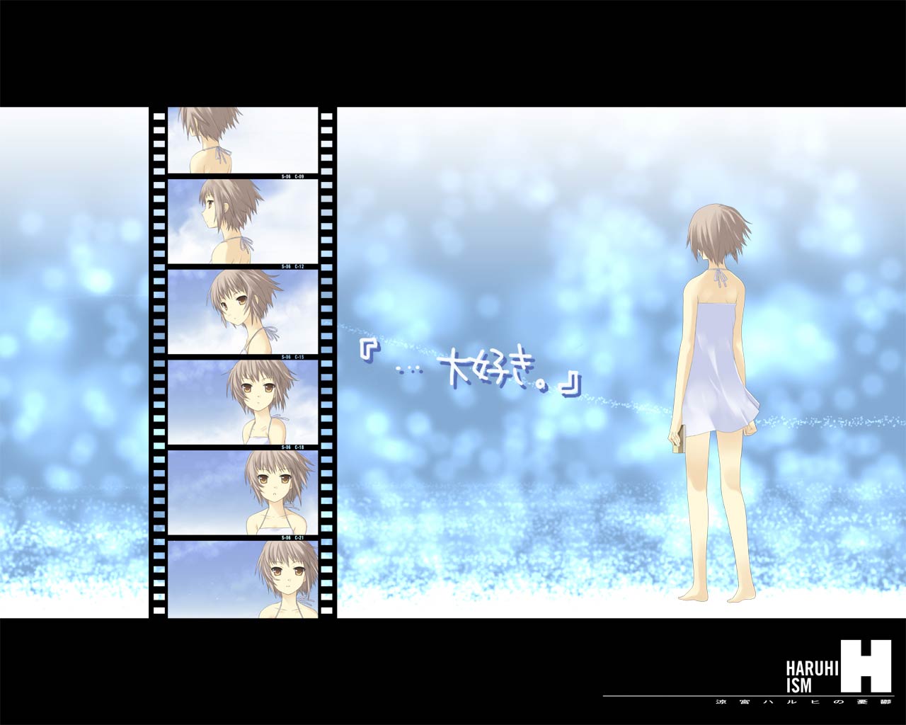 Description: A girl in a short dress standing in front of a film strip with a picture of her back to the camera.