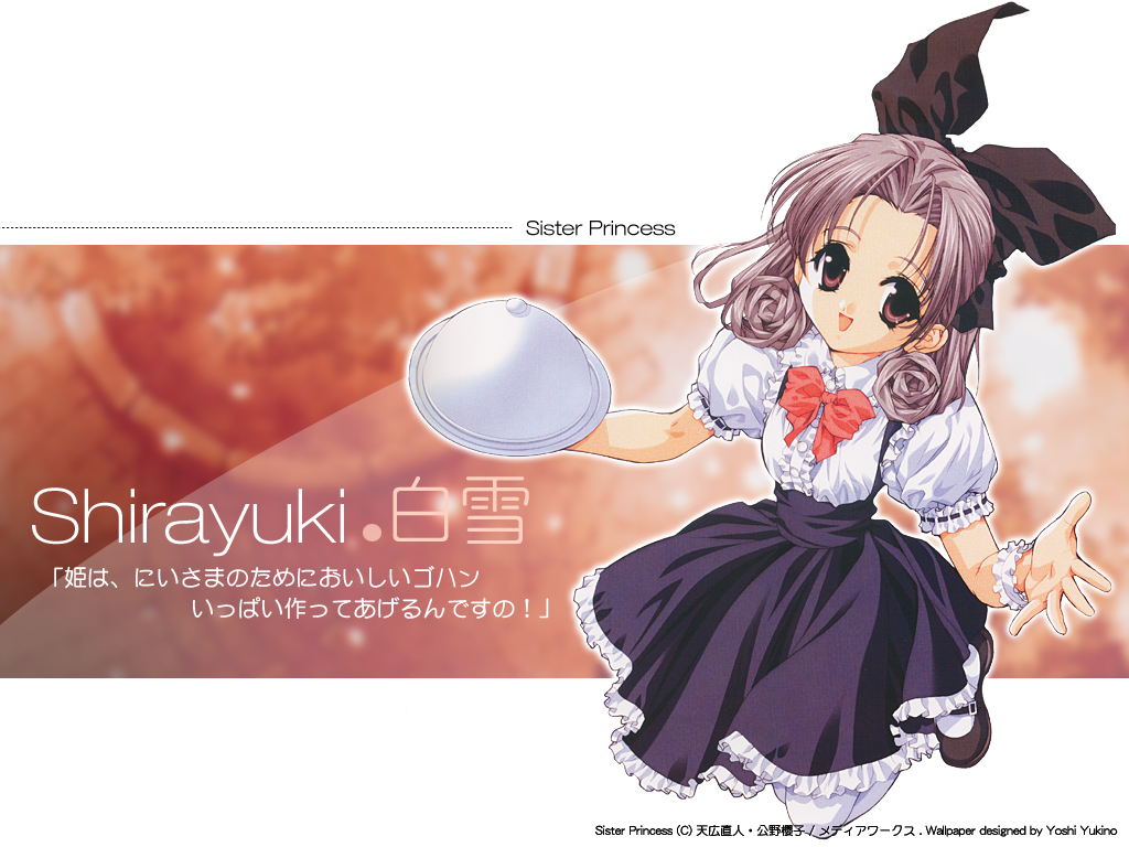 Description: A girl in a dress holding a plate with a caption in japanese on it that says.