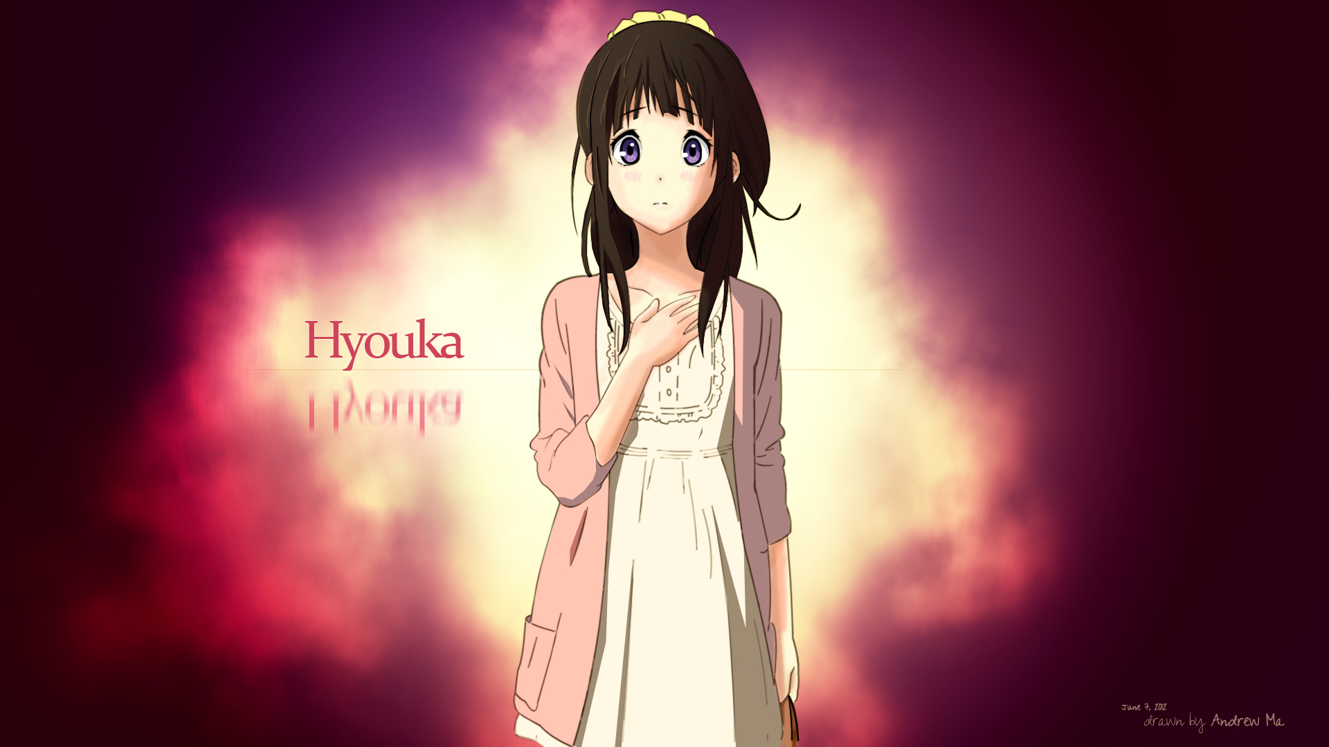 Description: A girl in a dress standing in front of a purple background with the words hyrokua on it.