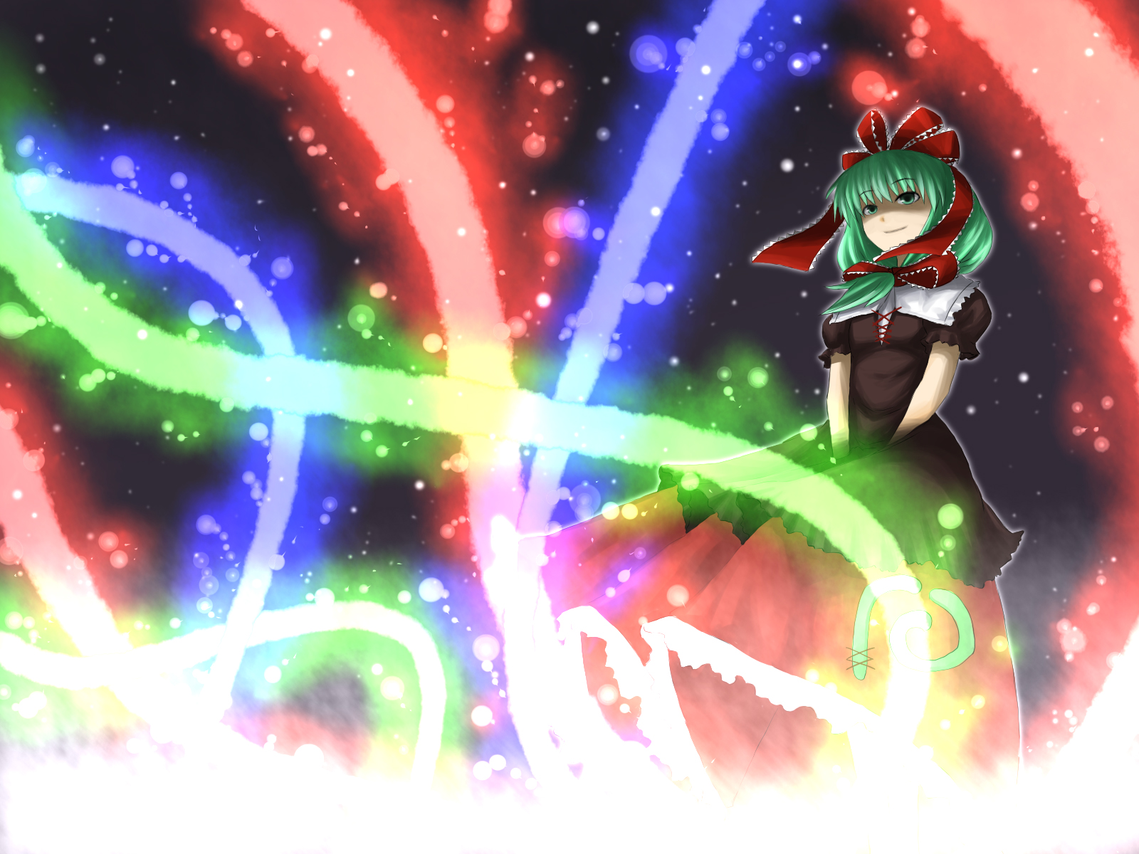 Description: A girl in a dress and a red hat is standing in front of a colorful background with a star.