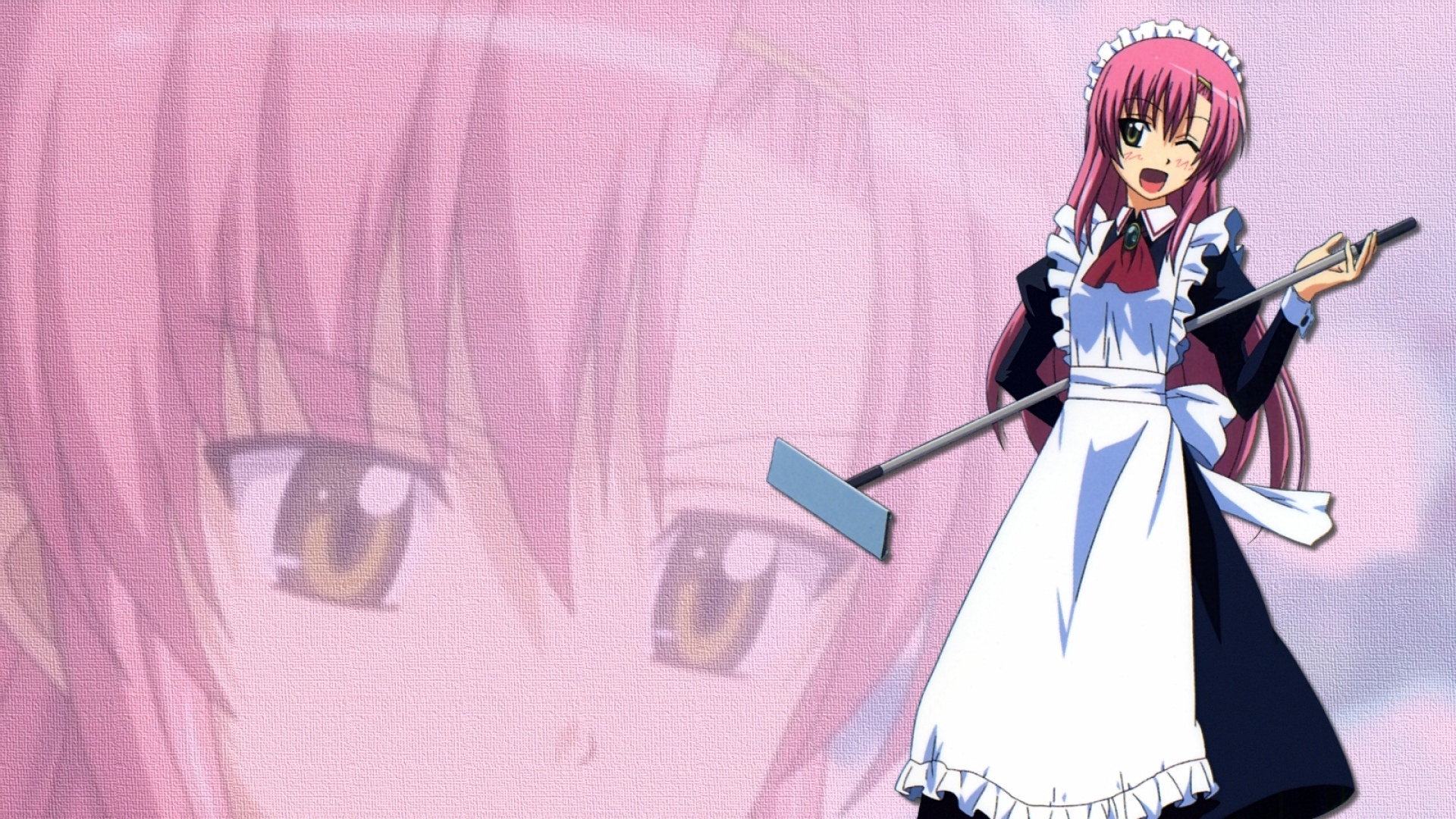Description: A girl in a dress holding a shovel and a stick in her hand with a pink background and a pink background.