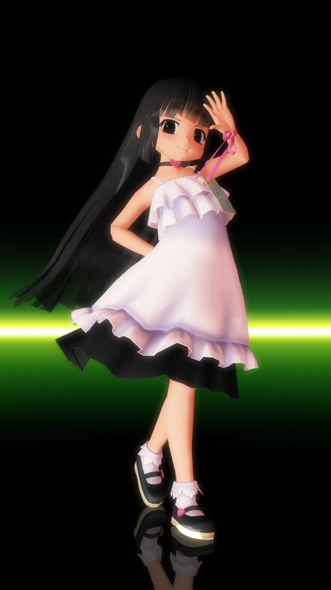 Description: A girl in a dress and sneakers is standing in the dark with her hand on her head and her hair in the air.