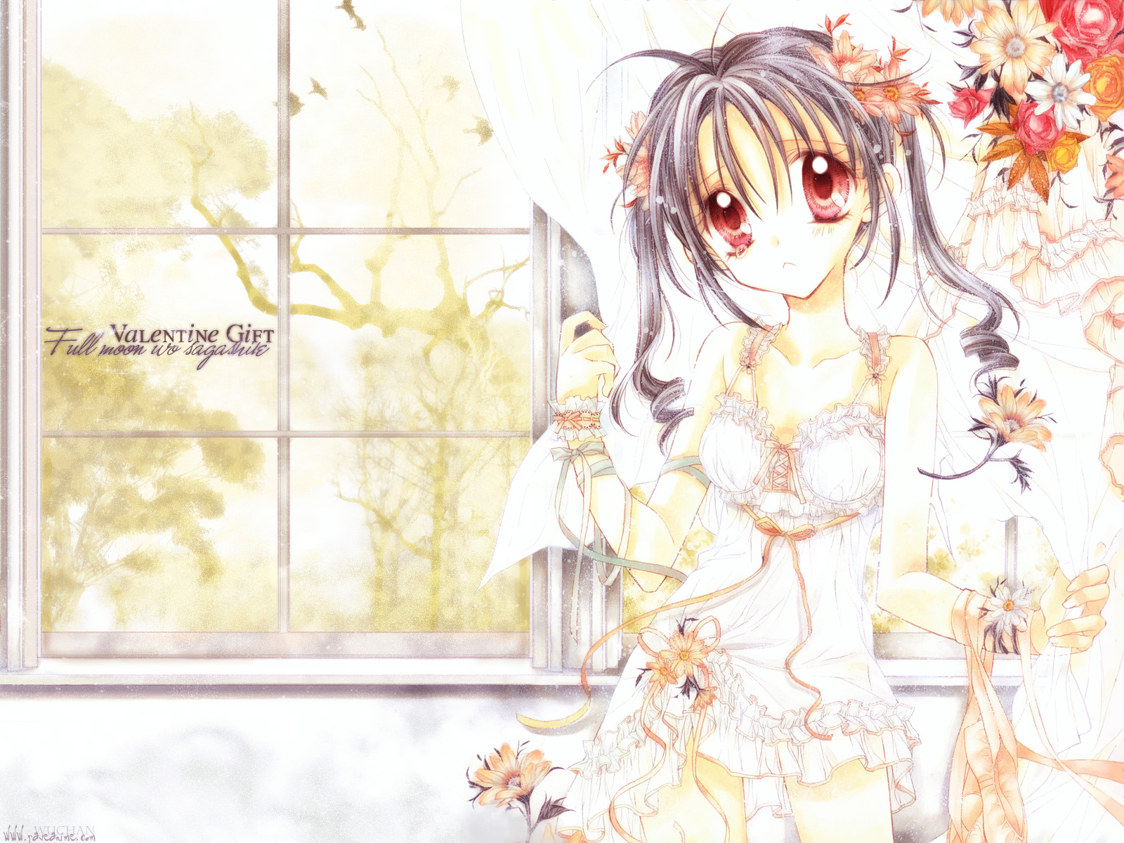 Description: A girl in a dress standing next to a window with flowers on it and a vase of flowers in front of her.