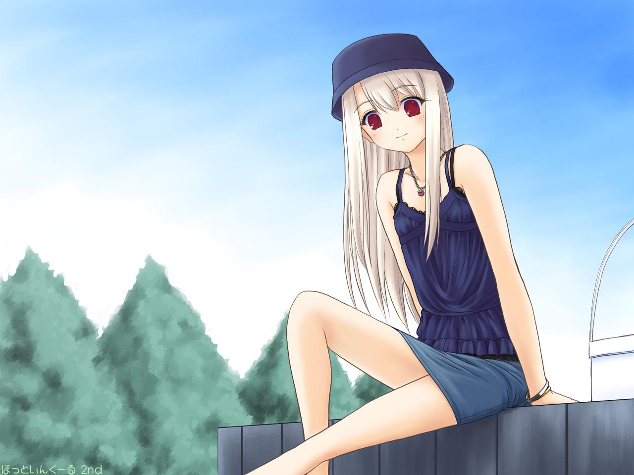 Description: A girl sitting on a fence with a hat on her head and a blue dress on her body and a blue sky in the background.