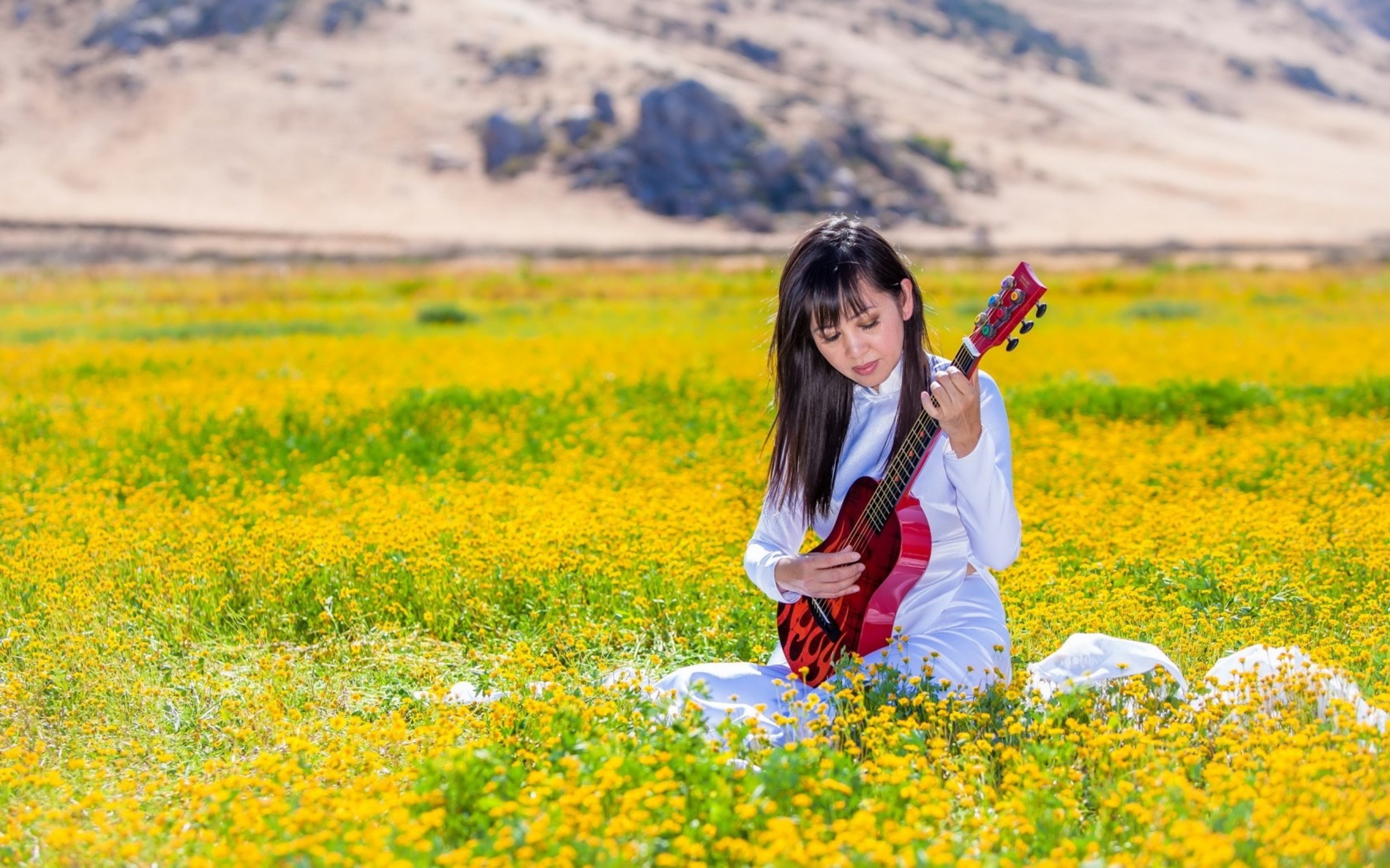 Description: A girl sitting in a field with a guitar in her hands and a book in her hand.