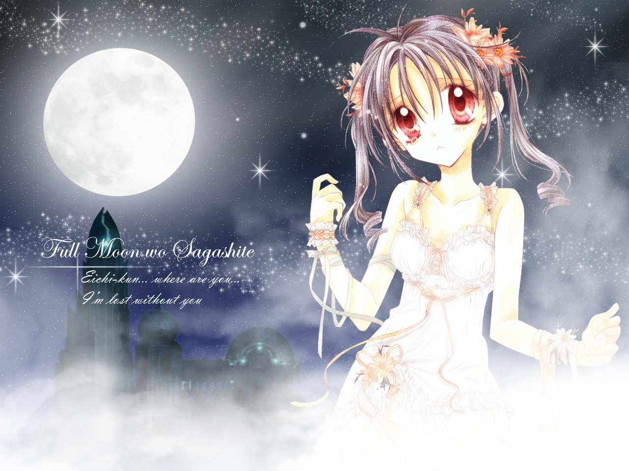 Description: A girl with a flower in her hair standing in the clouds with a full moon in the background and a castle in the distance.