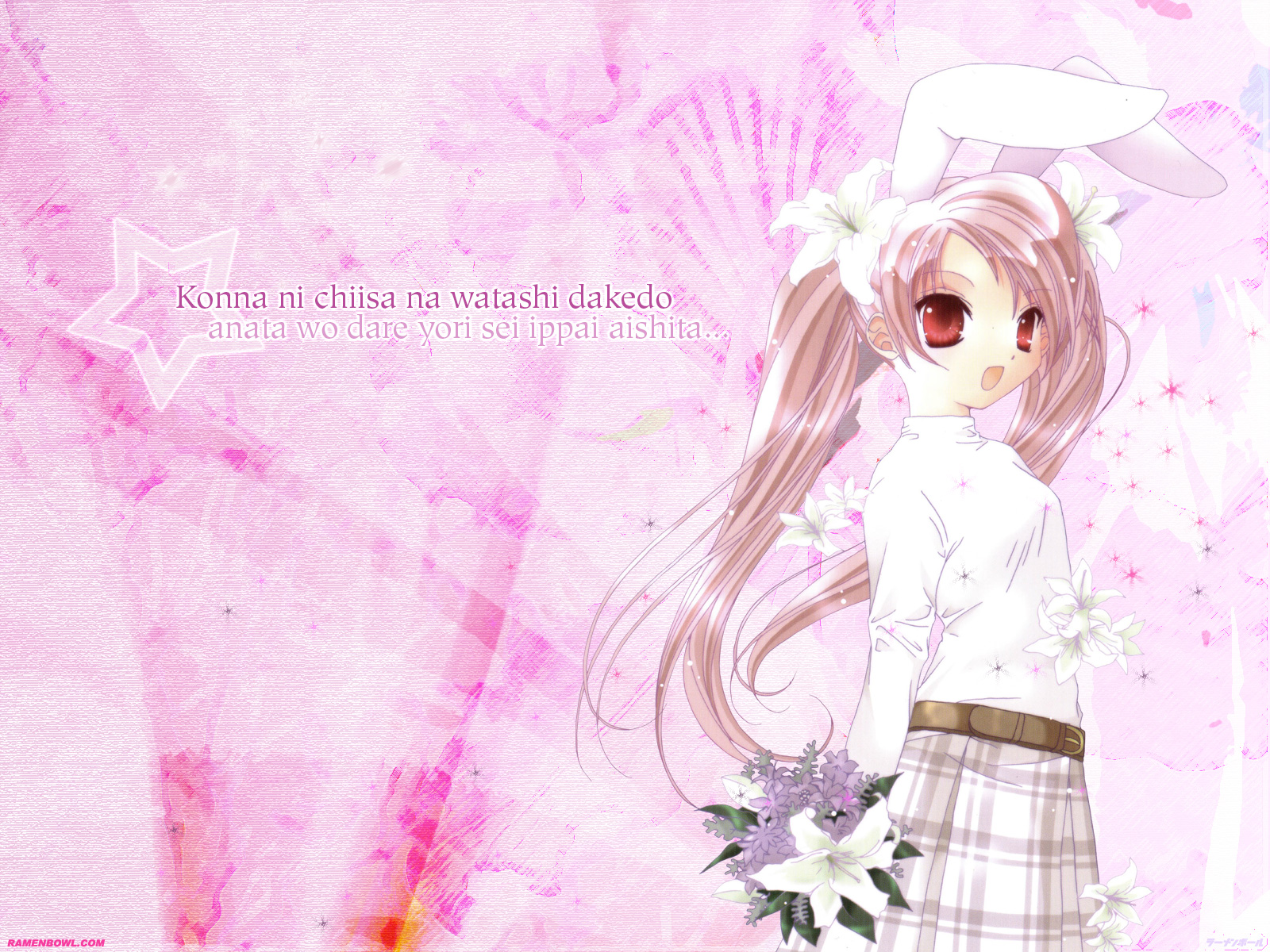 Description: A girl with long hair and a flower in her hair is standing in front of a pink background with a quote.