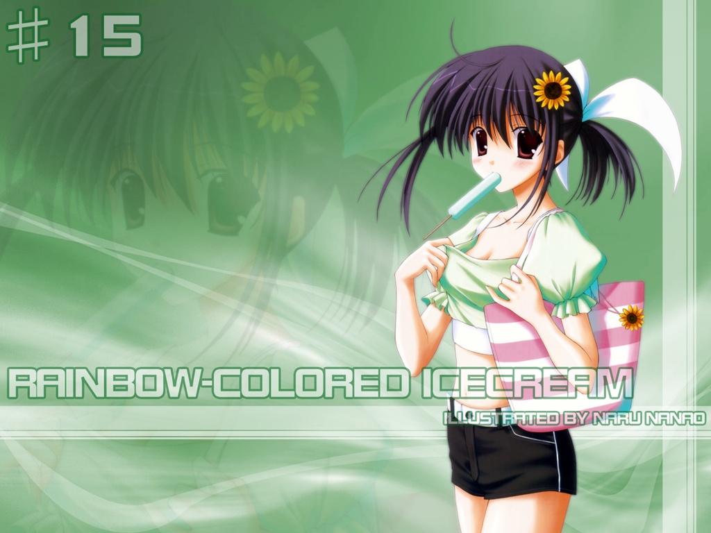 Description: A girl with a flower in her hair holding a toothbrush in her hand and a green background with the words rainbow - colored ice cream.