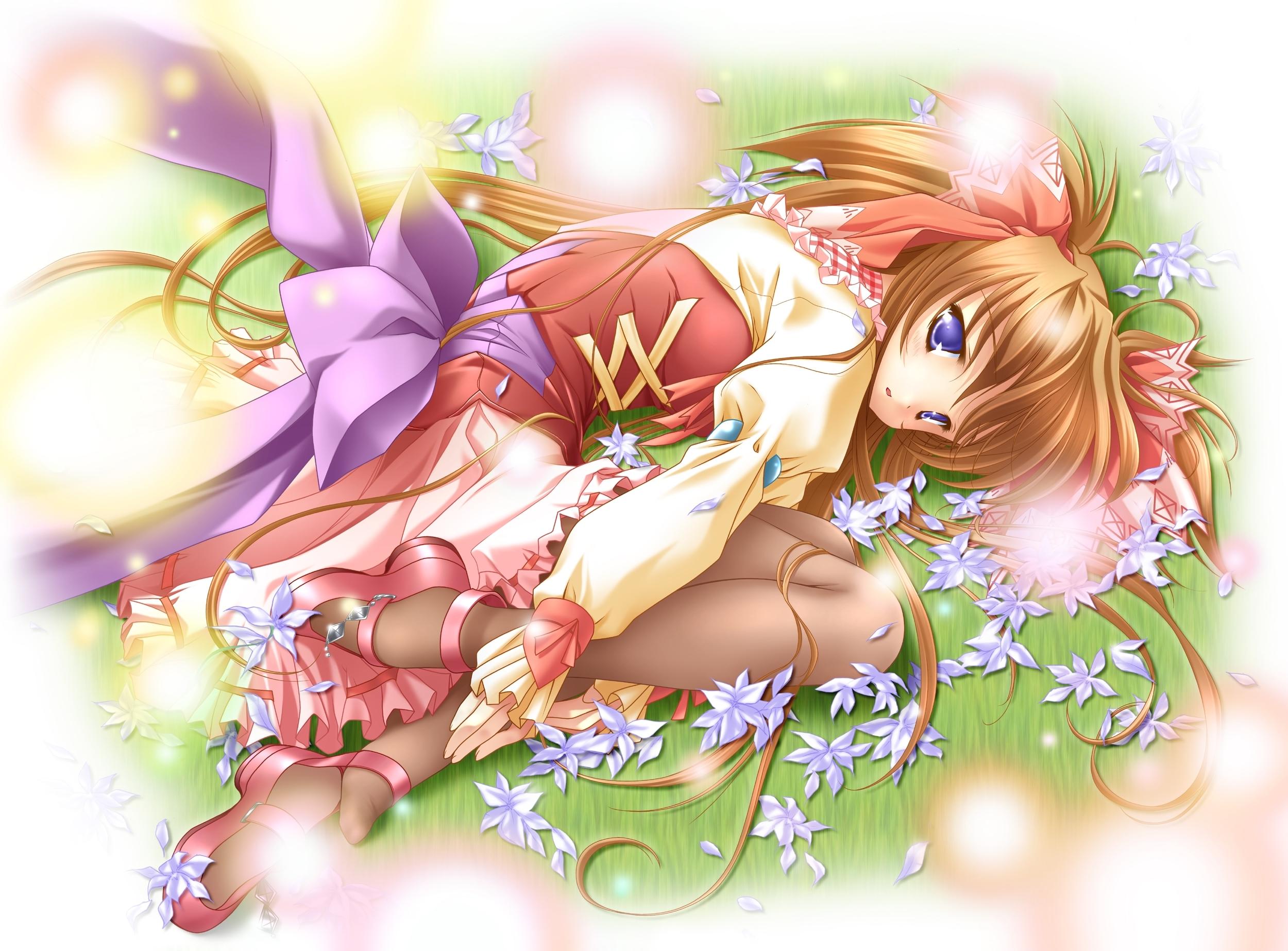 Description: A girl laying on the ground with flowers around her and a bow in her hair and a dress on her chest.