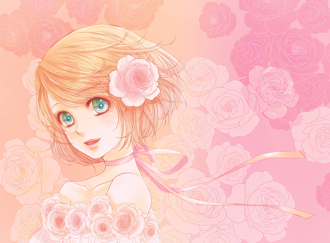 Description: A girl with flowers in her hair and a pink background with roses on it.