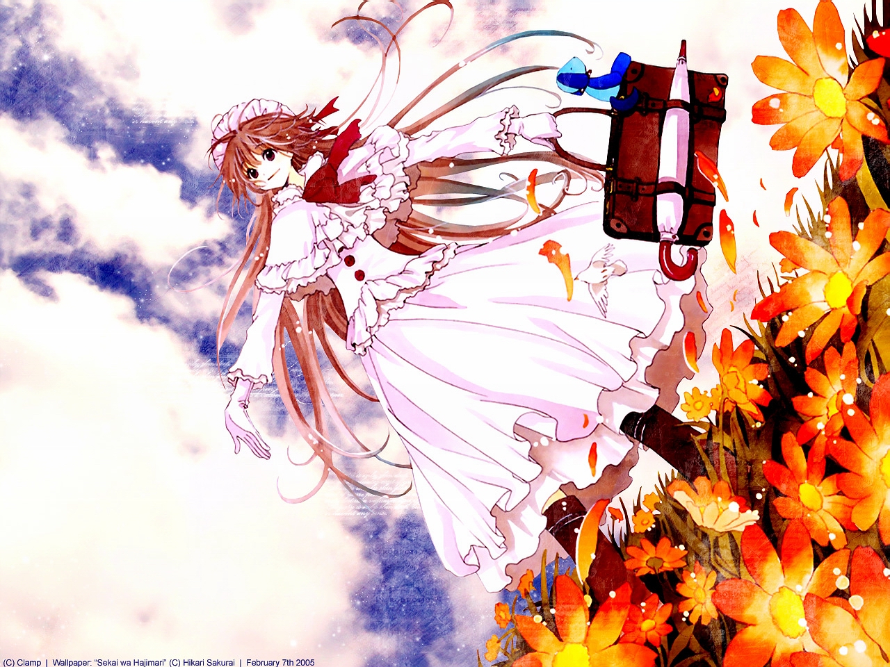 Description: A girl in a white dress flying through the air with a gun in her hand and flowers in the foreground.