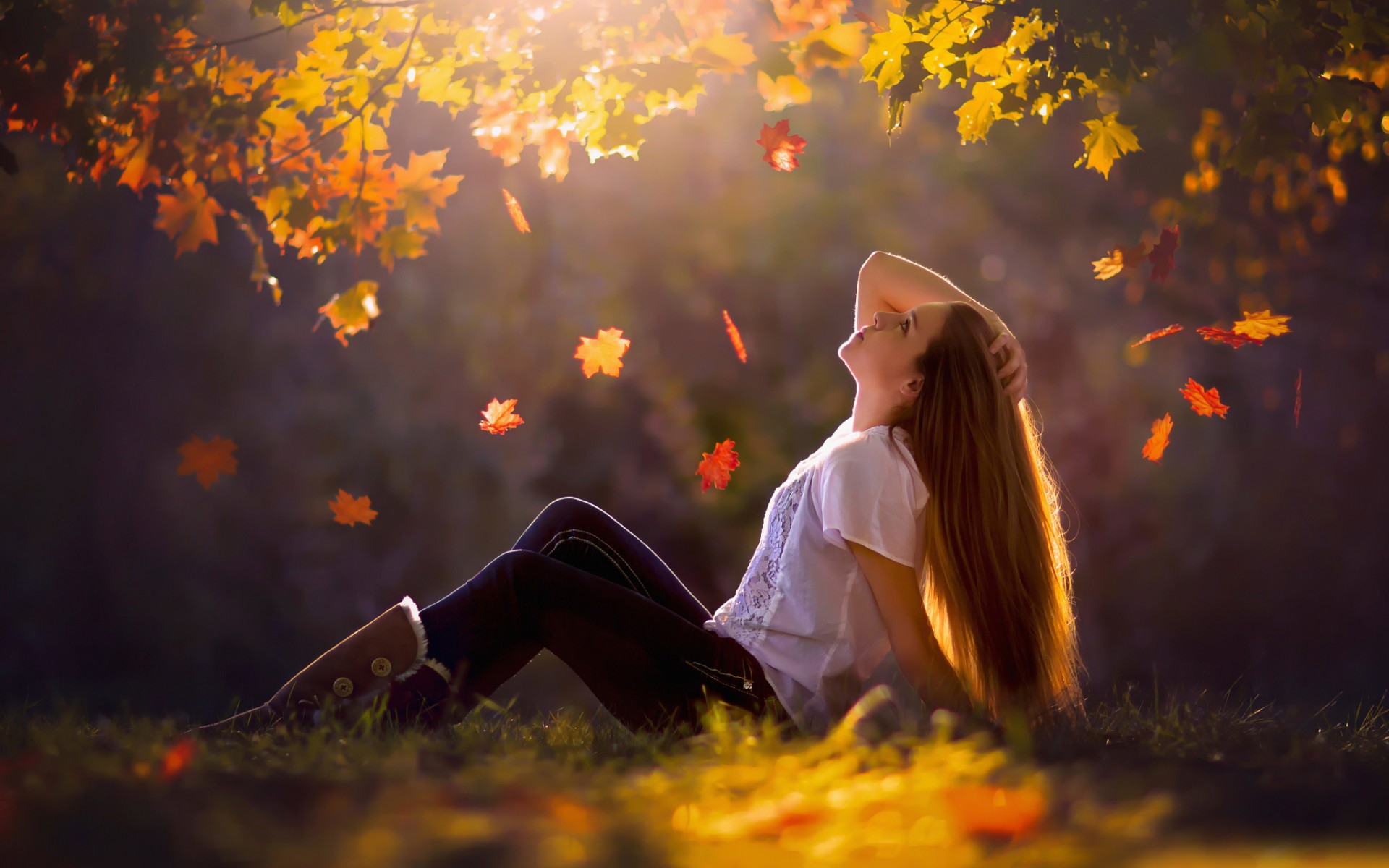 Description: A girl sitting in the grass with her long hair in the air and leaves falling from the trees behind her.