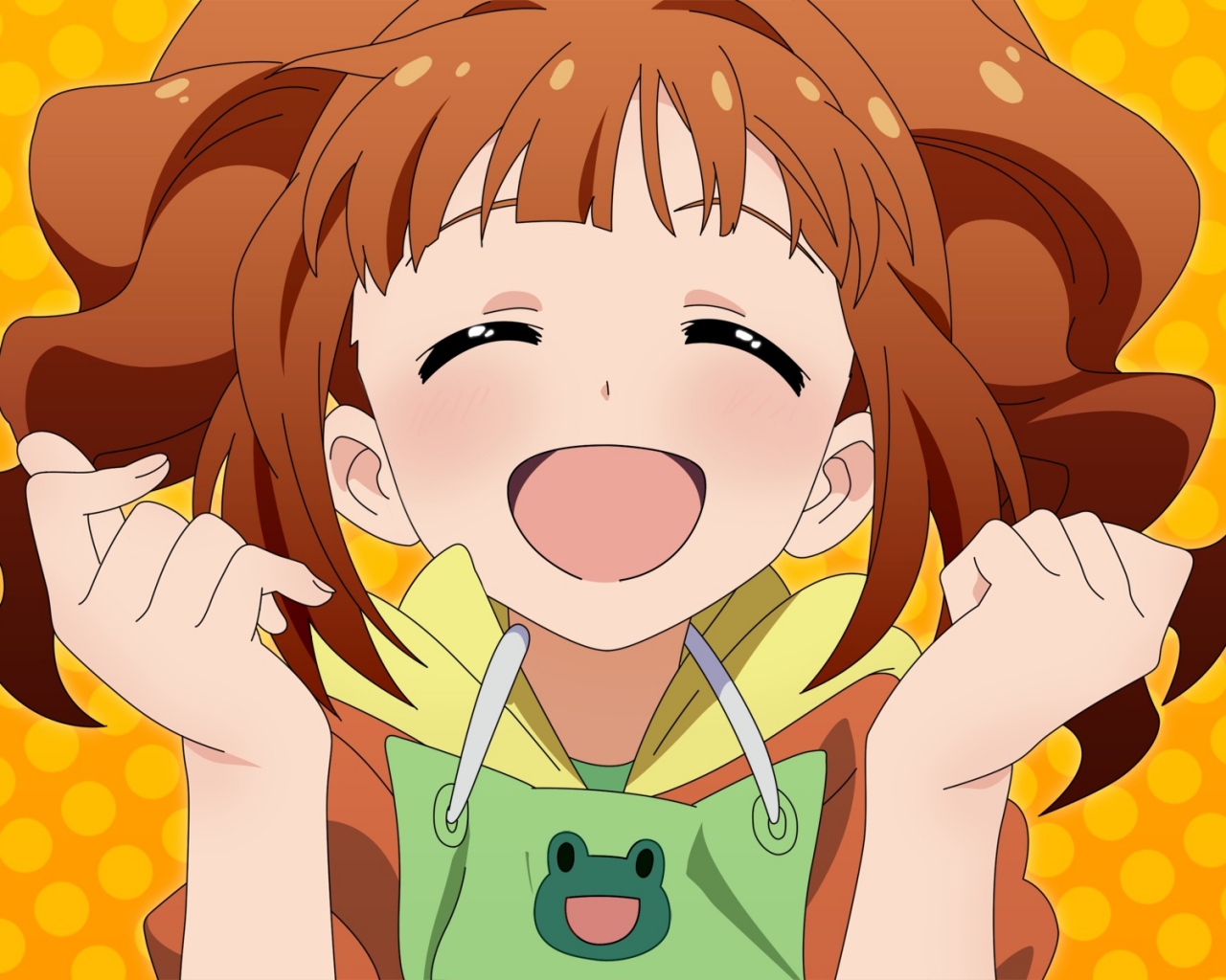 Description: A girl with a green bag and a yellow background with dots and dots.