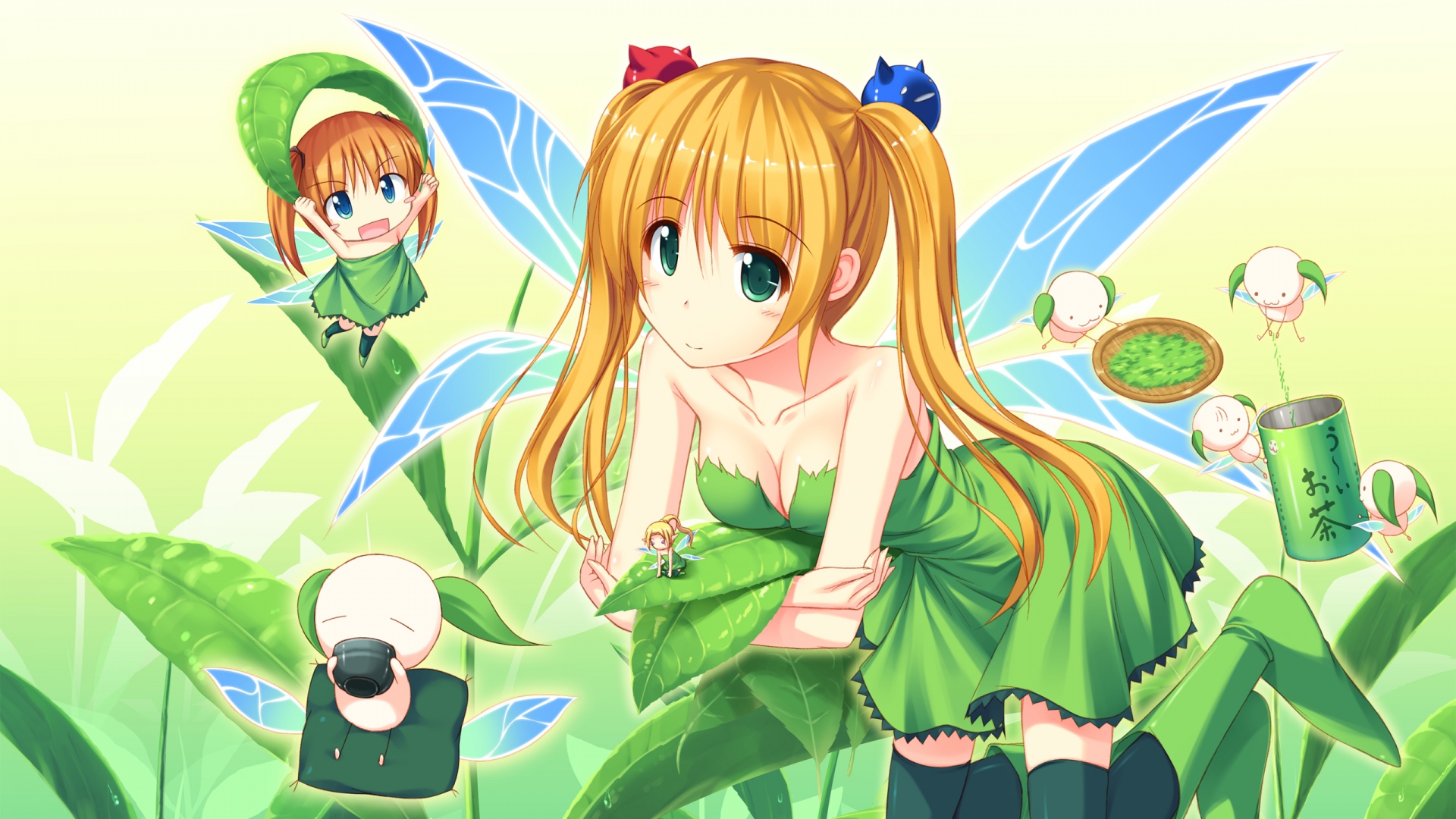 Description: A girl in a green dress is standing in a field with a green plant and a green tinker.