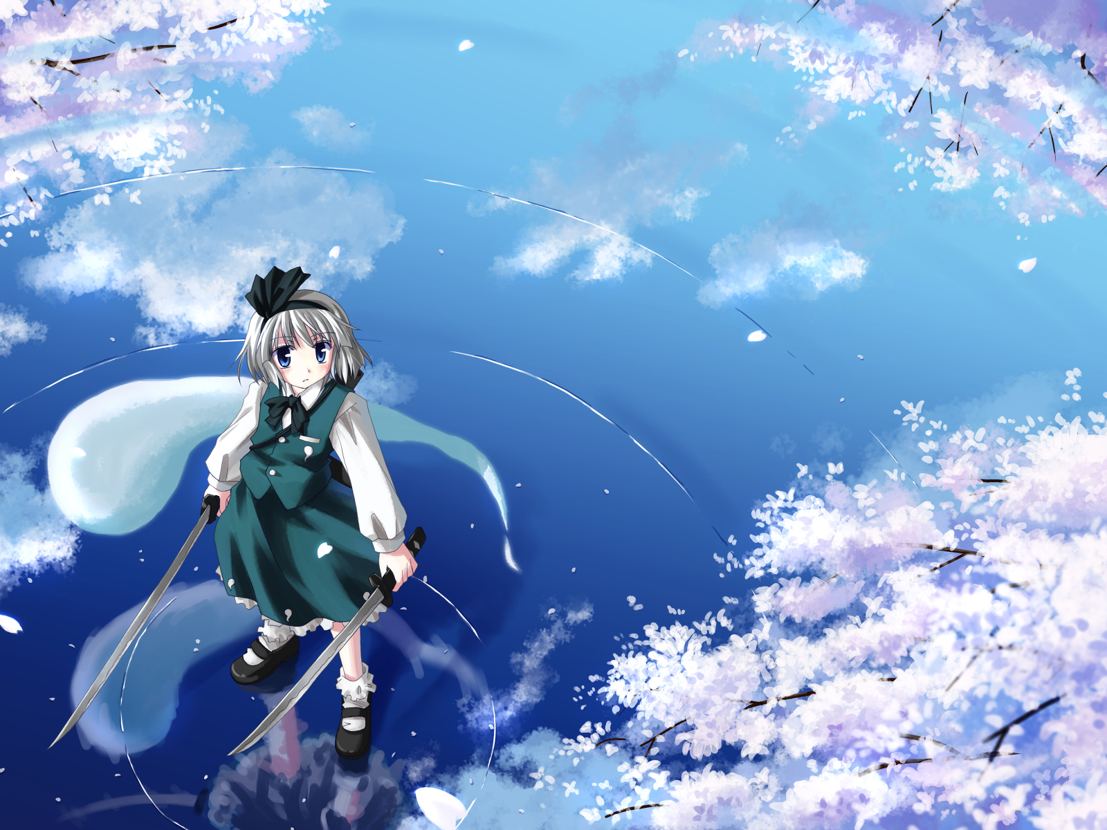 Description: A girl in a green dress is flying through the air with a sword in her hand and a cloud in the background.